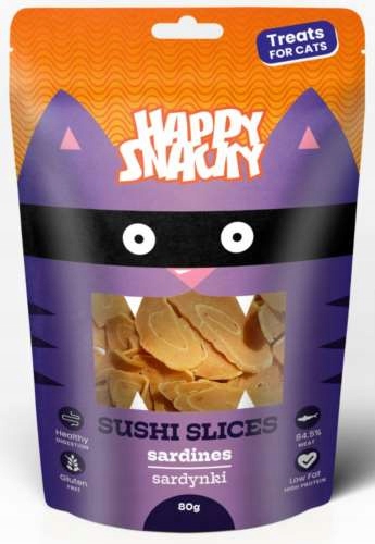 Plasterki sushi z sardynki to smaczny i pożywny przysmak dla kota w formie okrągłych roladek o średnicy 4 cm. Idealne jako uzupełnienie codziennej diety, nie zawierają glutenu. Opakowanie zawiera 80 g produktu.