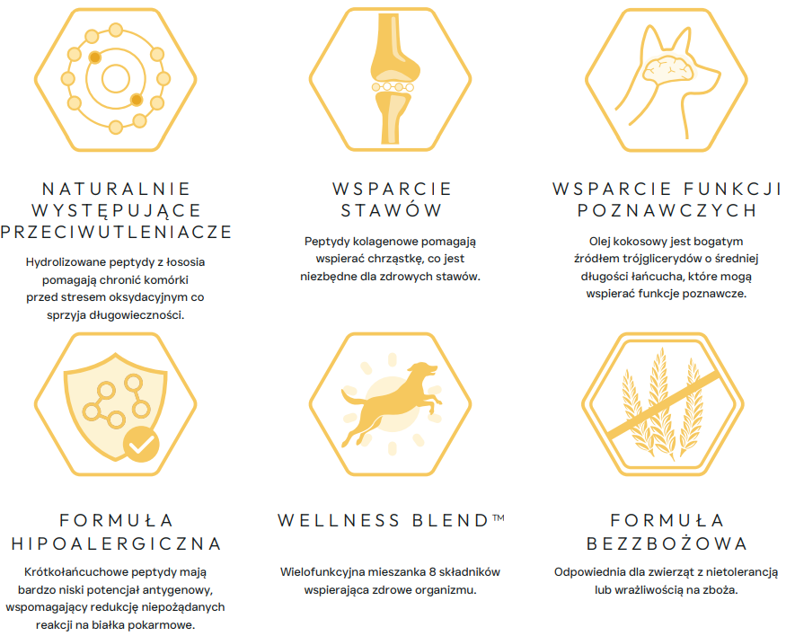Świeżo przygotowany hydrolizowany łosoś (32,5%), ziemniaki, bataty, hydrolizowany suszony łosoś (15,5%), olej z łososia (6%), hydrolizowany wywar z łososia (2,5%), olej kokosowy (2%), pulpa buraczana, minerały, mieszanka Wellness Blend™