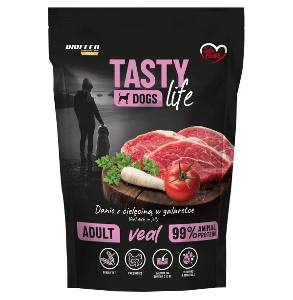 BIOFEED Tasty Dogs Life Cielęcina to pełnoporcjowa mokra karma w formie wykwintnego dania w galaretce, stworzona dla dorosłych psów wszystkich ras. Wykorzystanie delikatnej cielęciny sprawia, że posiłek jest niezwykle aromatyczny i lekkostrawny, stanowiąc idealne rozwiązanie dla psich smakoszy oraz zwierząt o wrażliwym układzie pokarmowym.
