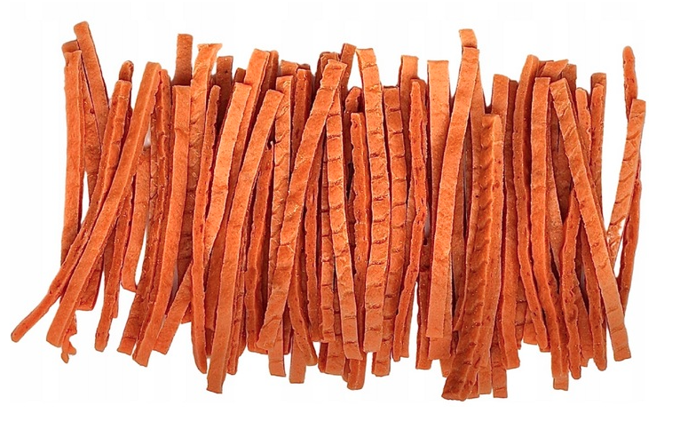 Idealna konsystencja: Miękkie paski o długości ok. 12 cm są łatwe do pogryzienia i chętnie przyjmowane zarówno przez szczenięta, jak i starsze psy.
