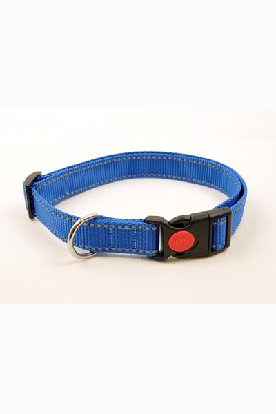 Obroża z wyjątkowo wytrzymałej taśmy polipropylenowej. Brzegi przeszyte odblaskową nicią. Klamra z zabezpieczeniem “Safety Click”. Szer. 25mm. Dł. 40-70cm.