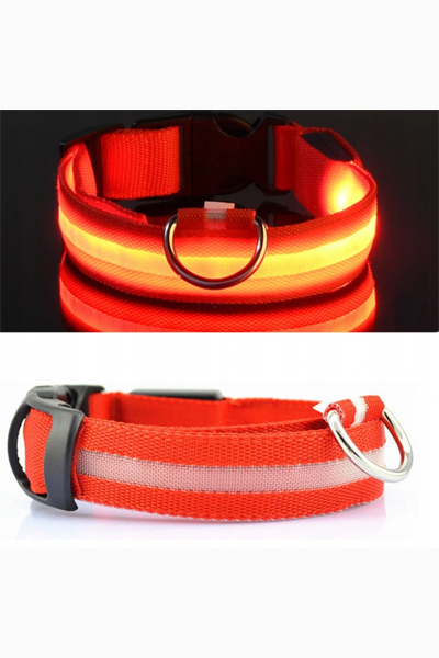 - Świecąca obroża LED wykonana z wytrzymałej taśmy nylonowej, zapinana na plastikową klamerkę.