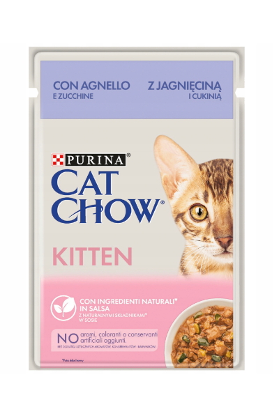 Dla produktu: PURINA CAT CHOW KITTEN Z JAGNIĘCINĄ I CUKINIĄ W SOSIE - 85G x 6